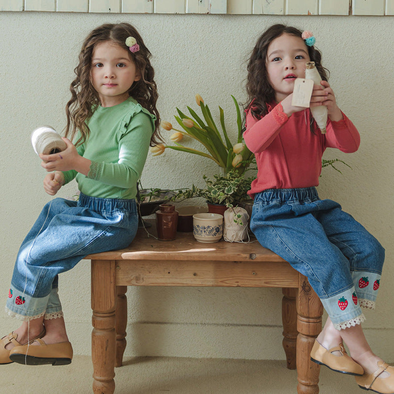 Jean Enfant Brodé Fraises – Coupe Confort & Ourlets Dentelle